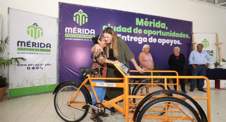 La alcaldesa de Mérida entrega un bastidor, cuatro máquinas de coser, 72 láminas de zinc y 16 triciclos en la colonia Emiliano Zapata Sur II; durante 2025 se han otorgado apoyos en beneficio de más de 7 mil personas en situación de pobreza