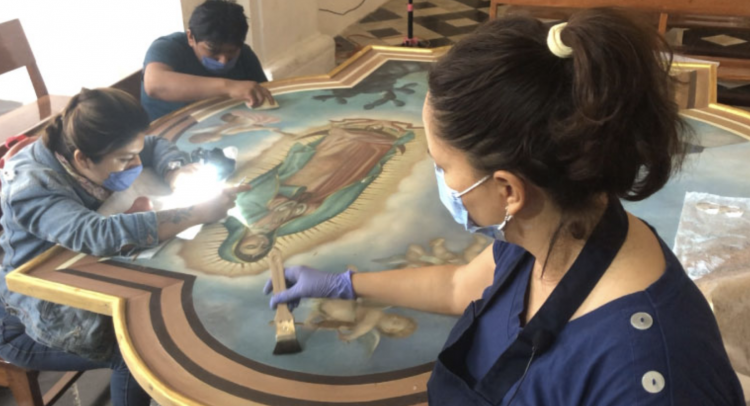 Las labores se realizan a través del INAH, bajo la coordinación de Leticia Jiménez Hernández; realizan limpieza de la superficie pictórica y la incorporación de un soporte de tela en las áreas faltantes o agrietadas