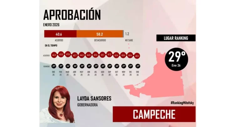 Con apenas un 40.6 por ciento de aprobación y un 58.2 por ciento de desaprobación, la gobernadora Layda Sansores enfrenta una profunda crisis de credibilidad entre la población campechana, según la encuesta de Consulta Mitofsky de enero de 2026, que la ubicó en el lugar 29 de 32 mandatarios estatales.