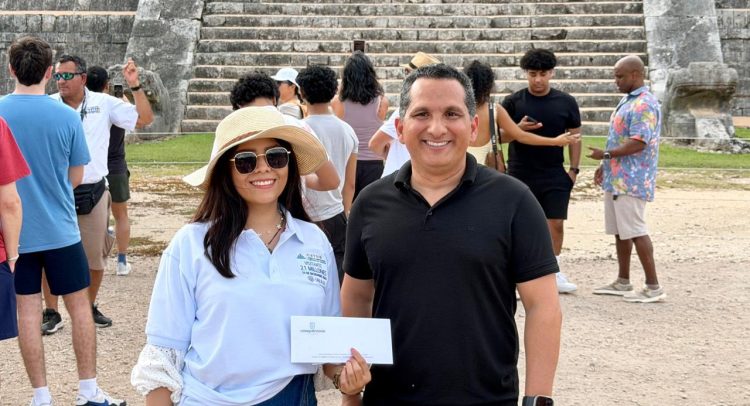 “Bienvenida Dulce, me da mucho gusto que hayas decidido, junto con tu familia, venir a Yucatán y a Chichén Itzá. Aquí recibimos a los turistas con lo mejor que tenemos, empezando con nuestra hospitalidad, siéntete como en casa”, expresó Jorge Carillo, al entregarle la camiseta conmemorativa.