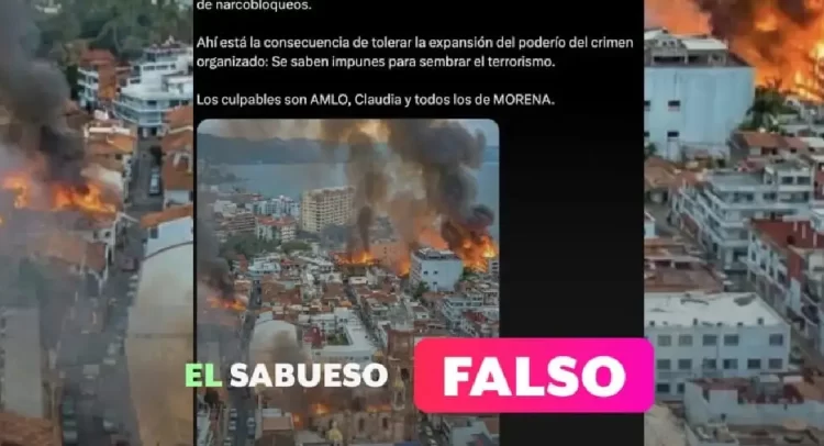 Entre el material falso destaca una escena dantesca en la que, desde el aire, se aprecia la zona cercana a la parroquia de Nuestra Señora Guadalupe, en Puerto Vallarta, envuelta en llamas y con gran parte de la ciudad bajo incendios masivos y columnas de humo negro.
