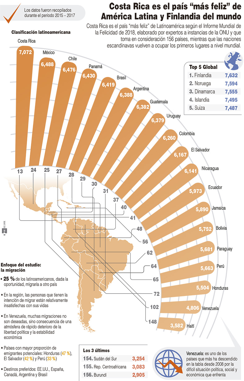 COSTA RICA es el país de Latinoamérica “más feliz”, según el Informe Mundial de la Felicidad de 2018 que toma en consideración 156 países, que ha sido elaborado por expertos a instancias de Naciones Unidas y presentado ayer en el Vaticano.