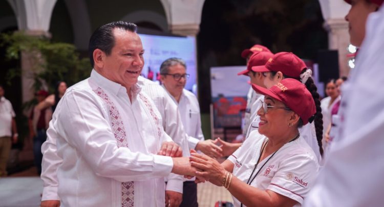 La secretaria del Bienestar, Ariadna Montiel Reyes; el gobernador de Yucatán, Joaquín Díaz Mena y el delegado de los Programas de Desarrollo en el Estado, Rogerio Castro Vázquez, participaron ayer en la firma del convenio del programa Salud Casa por Casa en la entidad.