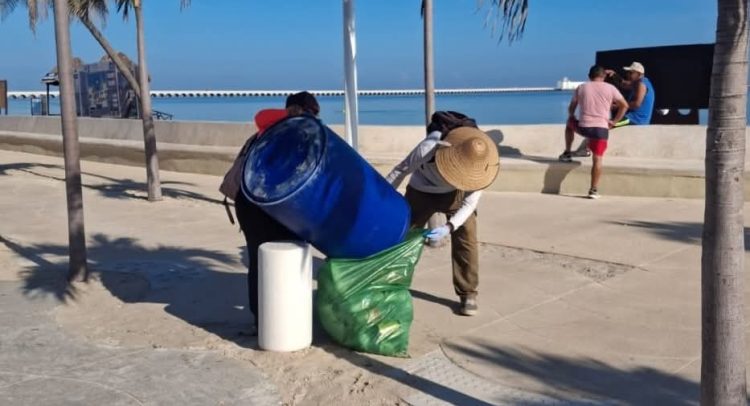 Por encomienda del alcalde Erik Rihani González, cada mañana mujeres y hombres de las brigadas de limpieza de playas de la Dirección de Catastro y Zofemat realizan labores de cuidado ambiental, retirando desechos como botellas, bolsas de plástico, colillas de cigarro, entre otros residuos.