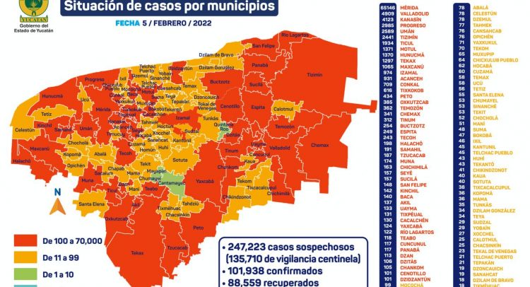De los casos positivos, 380 viven en Mérida, 55 en Kanasín, 40 en Hunucmá, 20 en Umán, 16 en Maxcanú,13 en Valladolid, 11 en Progreso, 9 en Motul, 8 en Acanceh, 6 en Kinchil, 3 en Tekax y Ticul, 2 en Cenotillo, Conkal, Izamal, Tecoh, Tetiz y Tizimín y uno en Akil, Chichimilá, Espita, Homún, Mayapán, Opichén, Oxkutzcab, Peto, Sanahcat, Seyé, Sucilá, Timucuy, Tzucacab, Ucú y Yaxkukul.