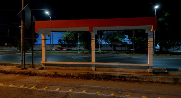 El segundo paradero, en el sentido contrario, es aún más precario. Se trata de una estructura reducida, con apenas dos bancas de concreto, recientemente pintadas con colores alusivos al partido político de la alcaldesa. Tampoco cuenta con iluminación propia, servicios eléctricos ni algún mecanismo de seguridad.