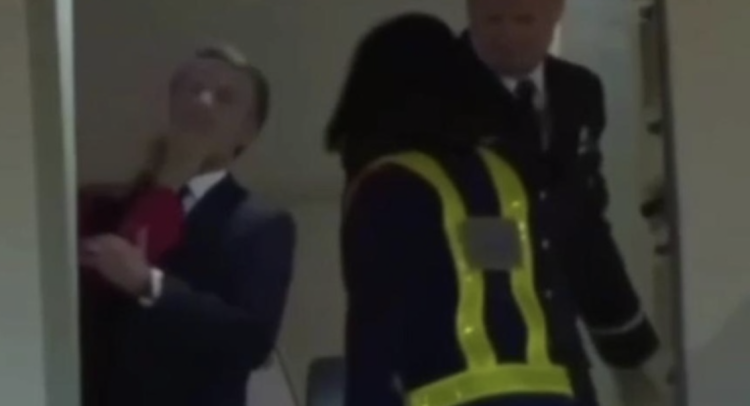 Emmanuel Macron da un cuarto de giro por el empujón de la mano de su mujer, se da cuenta entonces de que la puerta está abierta y de que lo que ha ocurrido se ha visto desde el exterior de la aeronave y lanza un saludo con una sonrisa.