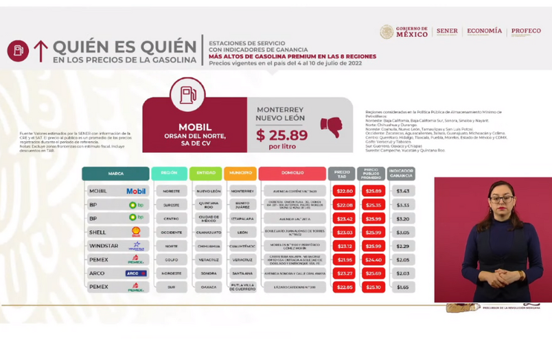 Ricardo Saheffield, titular de la Procuraduría Federal del Consumidor (PROFECO), mencionó durante la conferencia matutina del presidente, Andrés Manuel López Obrador, que dos estaciones proveedoras del tipo de combustible regular y premium en el municipio de Benito Juárez, fueron señaladas como las que más ganan en México, a pesar del incentivo fiscal del 100 por ciento a los combustibles.