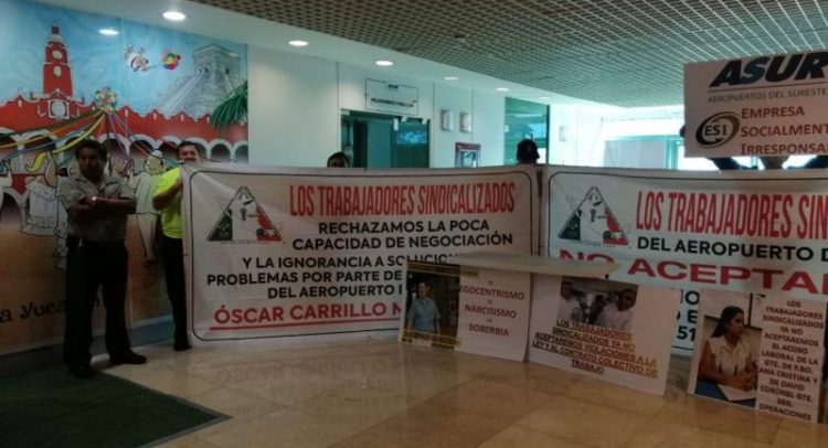 Sin interferir en las labores básicas y normales, tanto de la empresa como de los pasajeros, trabajadores sindicalizados del Aeropuerto de Mérida iniciaron ayer lunes una protesta “hasta ser atendidos” en sus demandas de mejor trato y respeto al contrato colectivo de trabajo por parte de los directivos de la empresa Asur.