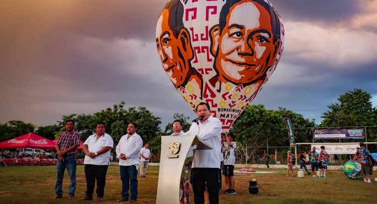 En el campo de fútbol de la localidad, el gobernador dio inicio a la jornada con la elevación de un globo conmemorativo del Renacimiento Maya, elaborado por artesanos locales con más de cinco mil piezas de papel y cuatro meses de trabajo.