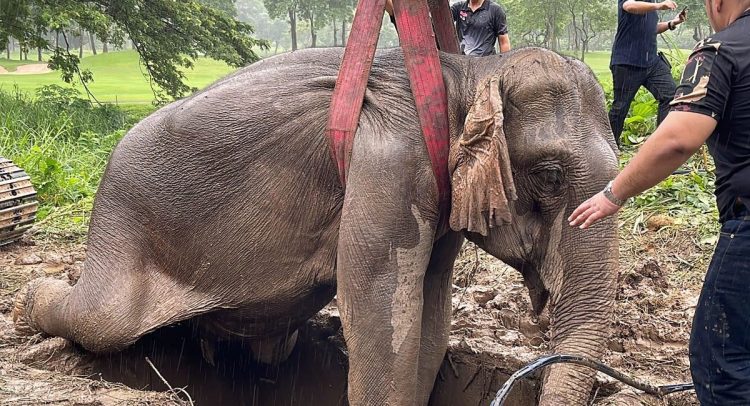 Una lluvia torrencial hizo que el rescate fuera más complicado, por lo que los trabajadores usaron una excavadora y una grúa para rescatar a la mamá elefante primero. Luego de ser salvada, el veterinario se acercó para realizarle resucitación cadiopulmonar, ya que debido al estrés sufrió un paro cardíaco.