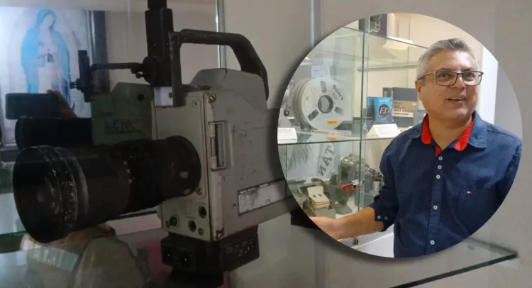 En las vitrinas, se puede observar una grabadora tres cuartos que se utilizó a mediados de los 80s, una casetera que iba acompañada de una cámara que grababa en cinta y que era tan pesada que requería que un asistente la cargara.