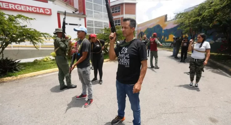 El Ejército se desplegó en la principal avenida de esta barriada, que el año pasado registró protestas contra la reelección de Nicolás Maduro, para instruir en el uso de armamento a civiles que se anotaron voluntariamente para colaborar con el ejército.